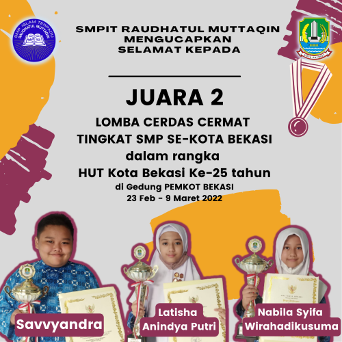 Anak-anak berprestasi tersebut bersaing dengan 24 sekolah diwilayah bekasi. Mereka melewati 2 babak penyisihan, Semi Final dan Final. Rasa Bangga dan syukur terus kami sampaikan khususnya kepada Kepala Sekolah, Guru Pembimbing hingga Wali murid. Semoga siswa-siswi SMPIT Raudhatul Muttaqin semakin semangat dalam mengukir prestasi.